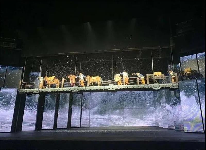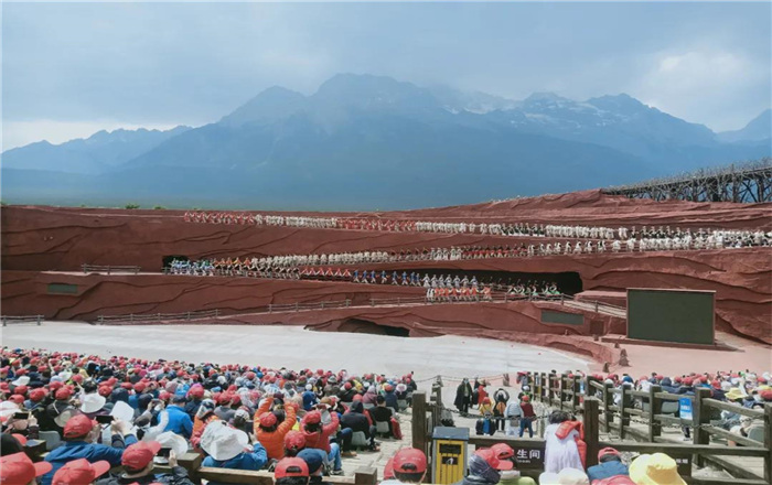 当你走进剧场,一个人工崖壁首先进入眼帘,它以美丽的玉龙雪山作为舞台背景,当你在观看表演时仿佛看到了六百年前茶马古道上的剽悍马帮穿行的场面,给你带来的视觉冲击力十分强劲。
