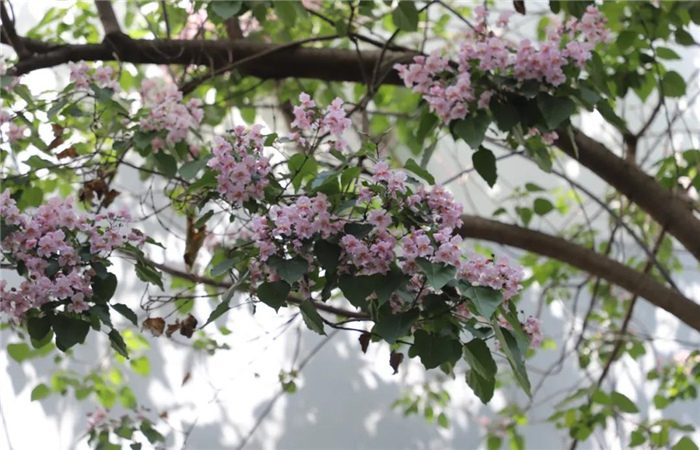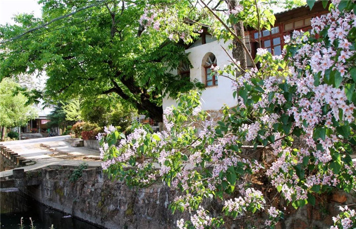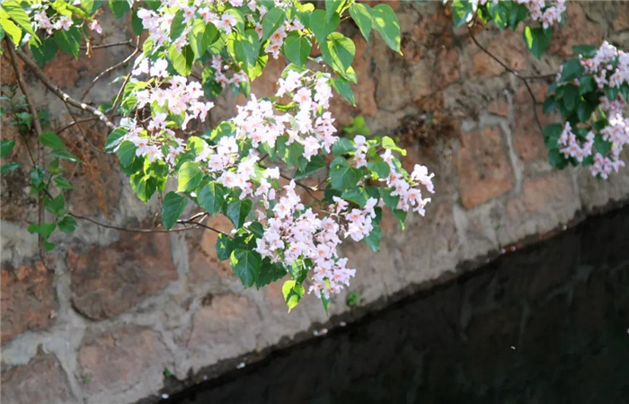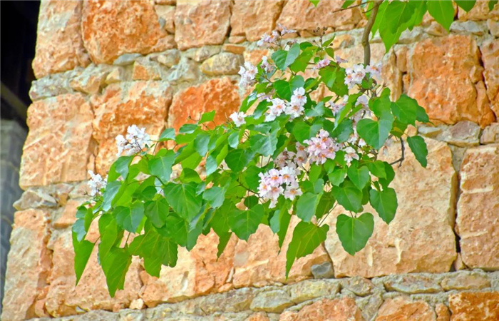 抬头的瞬间,你会看见一簇簇的楸木花挂满了枝头,它们和枝条间垂下来“一缕缕青丝”共同映衬着一侧的石墙,宛如一条条从山间流下的瀑布。时而随风奔腾,时而静如处子。
