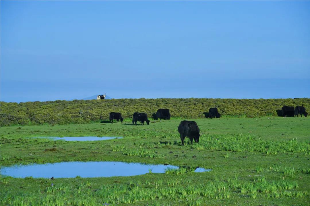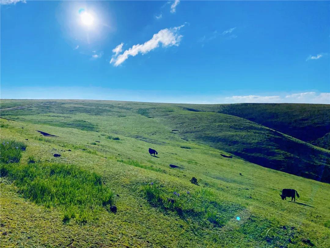 “哞哞哞……”静谧的草原上偶尔传来牛的叫声。一眼望去,牛群零星点缀,或安静地食着青青嫩草,或兴奋地奔腾在广阔的草地上,从这山越到那山,在属于它们的乐园里自由嬉戏,尽情享受着大自然的馈赠。