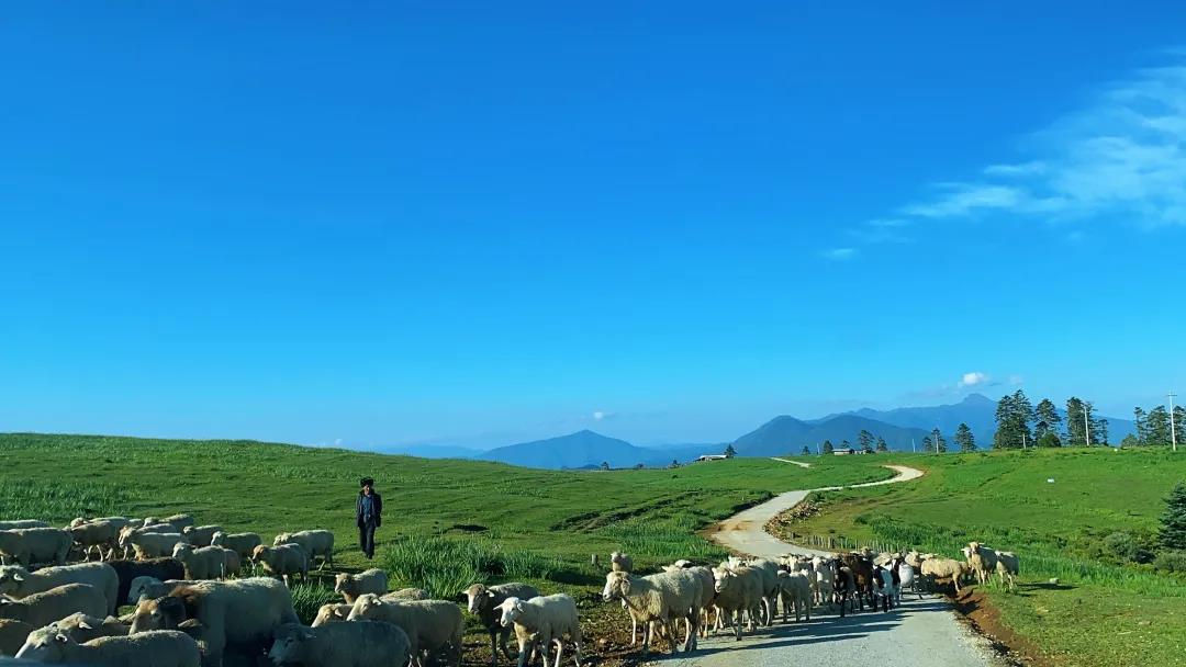 “咩咩咩……”一位老爷爷赶着羊群缓缓走来,机灵可爱的绵羊成群结队,沐浴着阳光,吮吸着青草的芳香,开始了它们一天的觅食之旅,一路向上,直至消失在草地与蓝天的交界线。