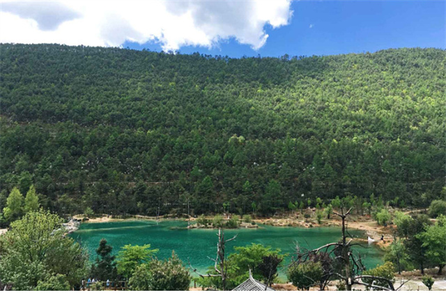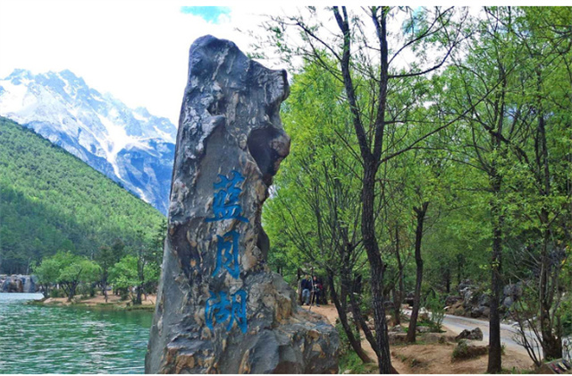 在晴天时,水的颜色是蓝色的,而且山谷呈月牙形,远看就像一轮蓝色的月亮镶嵌在玉龙雪山脚下,所以名叫蓝月谷。