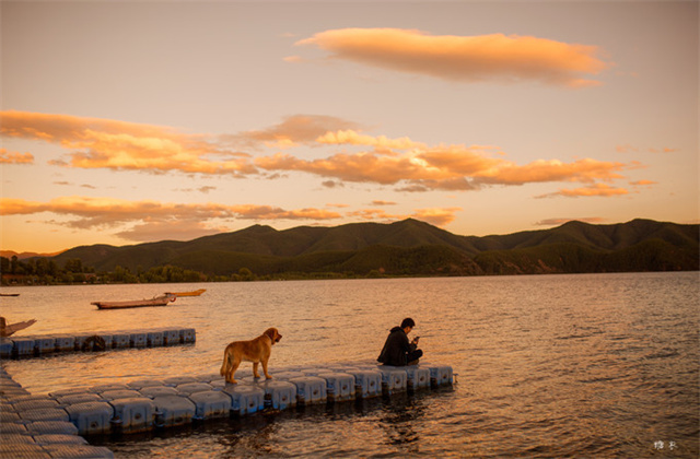 这里的日落依旧迷人。七年之前我看过的是草海的日落,七年之后我看到了达祖码头的日落。我太羡慕这个带着金毛一起来的小哥了,狗和主人一起坐在湖边,感受着日落时刻每一分每一秒的美好。