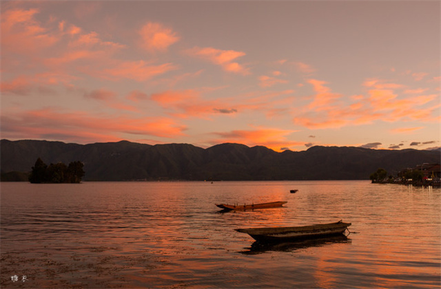 这里的日落依旧是天空之镜,云由白色变成了梦幻的橙红色,彩色的天空将整个湖面都染上了迷人的色彩。这里,依旧是我心中最美的泸沽湖。它也是我心中最浪漫的泸沽湖。