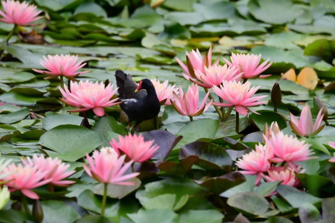 不同品种的百余株睡莲在水中内亭亭玉立、妩媚展颜引得市民纷纷前来“打卡”留影