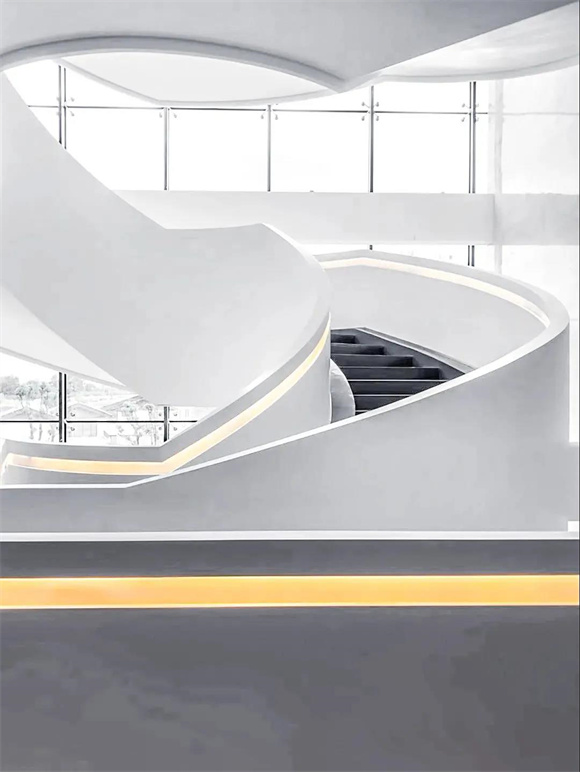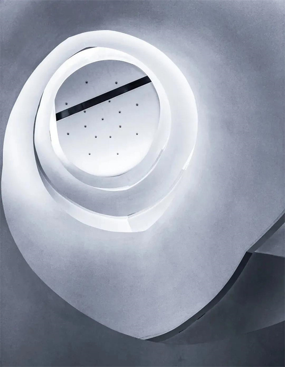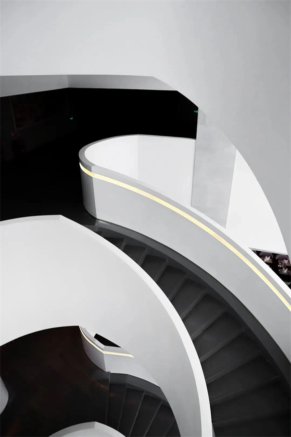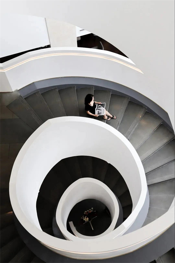 酒店内部尤为吸睛的当属旋转楼梯,纯白的外衣散发着云贝般的光泽,温暖的灯带顺着楼梯延展,优雅而颇具未来感。由下仰望,如云朵慢慢升腾;自上俯瞰,又如花朵悄然绽放,随手一拍都是INS风爆棚的美照,俨然已成为酒店的网红打卡点。