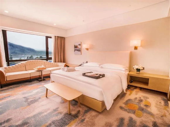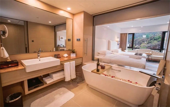 偌大的落地窗宽敞明亮,将窗外的风景引入室内。或远眺玉龙雪山雪峰皑皑,或观文笔山郁郁葱葱,或赏文笔海波光粼粼,或看庭院瀑布流水潺潺,让你足不出户也能欣赏不同风情。不仅如此,酒店还打造了十分有特色的庭院客房、观星套房,无论是闲坐庭院坐享美景,还是卧室躺看星空闪烁,都是旅途中难忘的回忆。