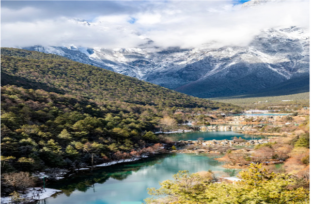 由于雪中路滑,摄影师只好停留在中间的蓝月湖和镜潭湖两湖之间,湛蓝的湖水,缠绕着玉龙雪山。