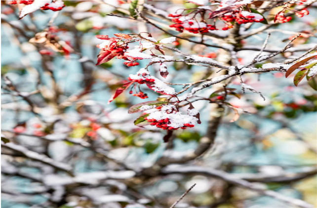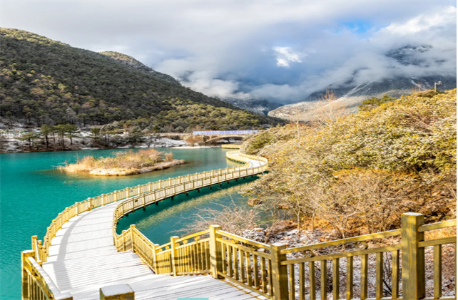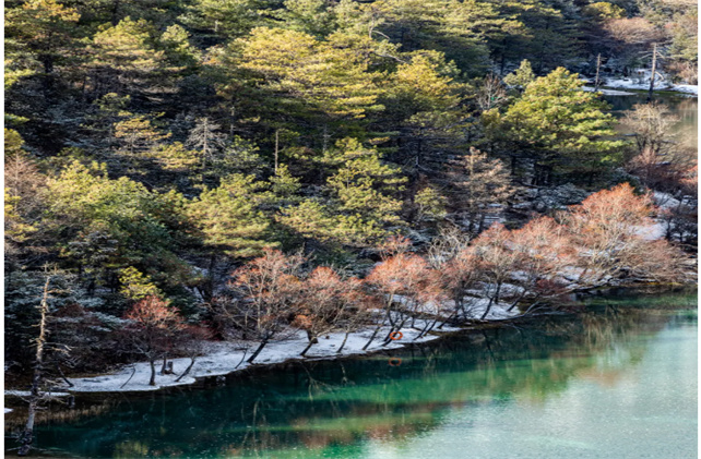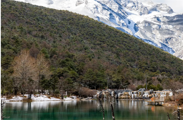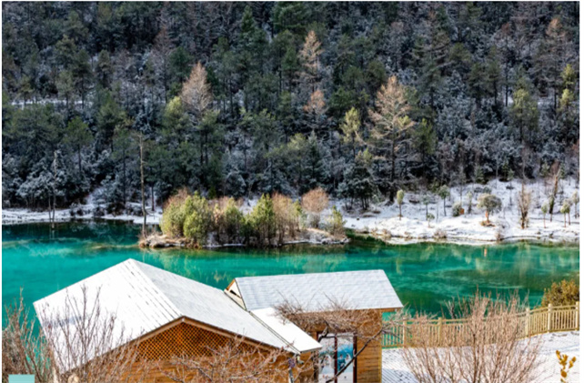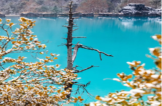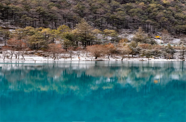 遇到初雪,神奇的一幕发生了,雪花缓缓落入蓝月谷中,湖底的泥沙也被染成了白色,偶然有几片还漂浮在水面上。
