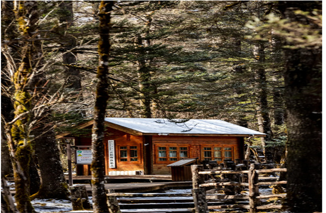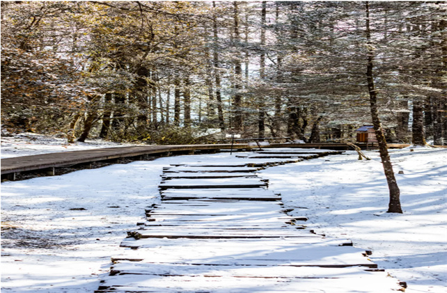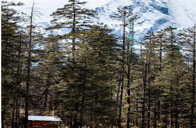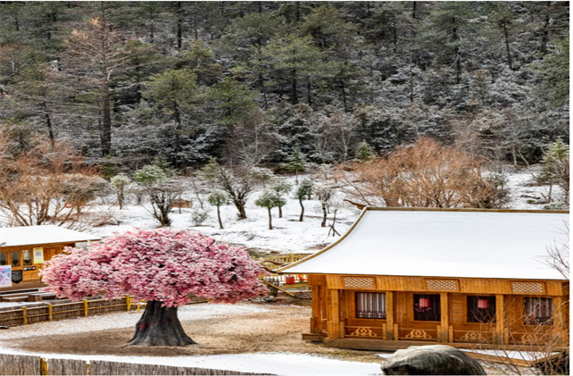 雪仍然下着、在镜水蓝湖上飘扬、在苍绿山林中飞舞、眼前的一切依然清晰,而远处已朦胧,正是那如梦如幻的仙境。