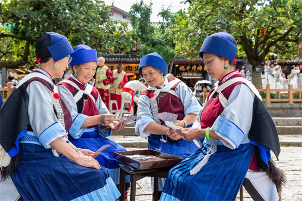 纳西男子则悠闲地遛着鸟,与邻里闲话家常,自在惬意;大树下,纳西阿妈们围坐一圈,打牌谈笑,那份温馨与和谐,
