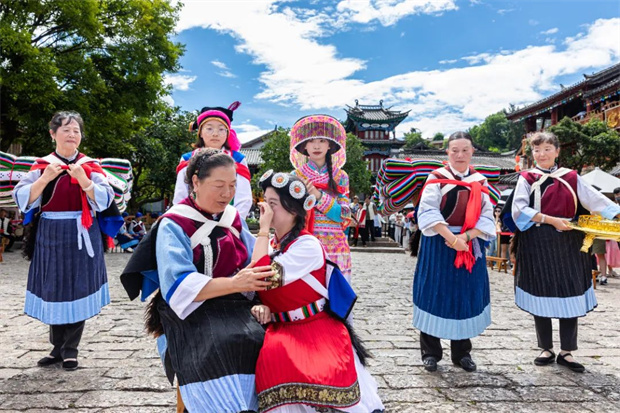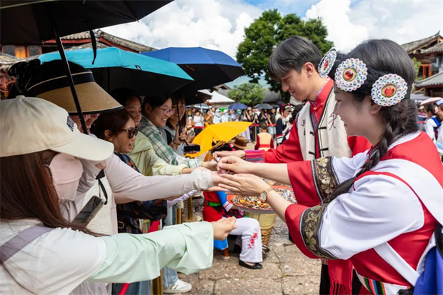 在丽江古城四方街,突然被纳西嬢嬢拉住手腕系上祝福的五彩线,或是被“新婚夫妇”热情地塞一把喜糖——这可不是穿
