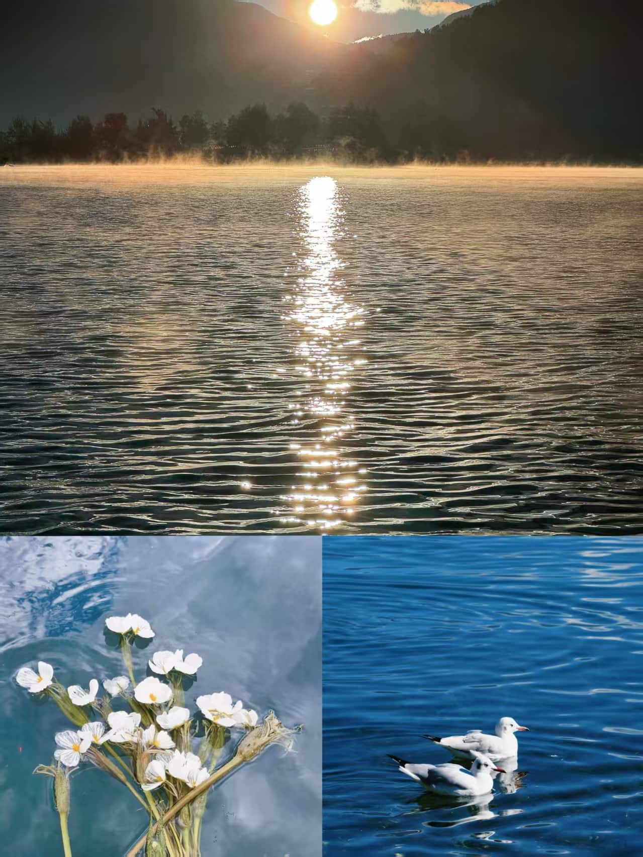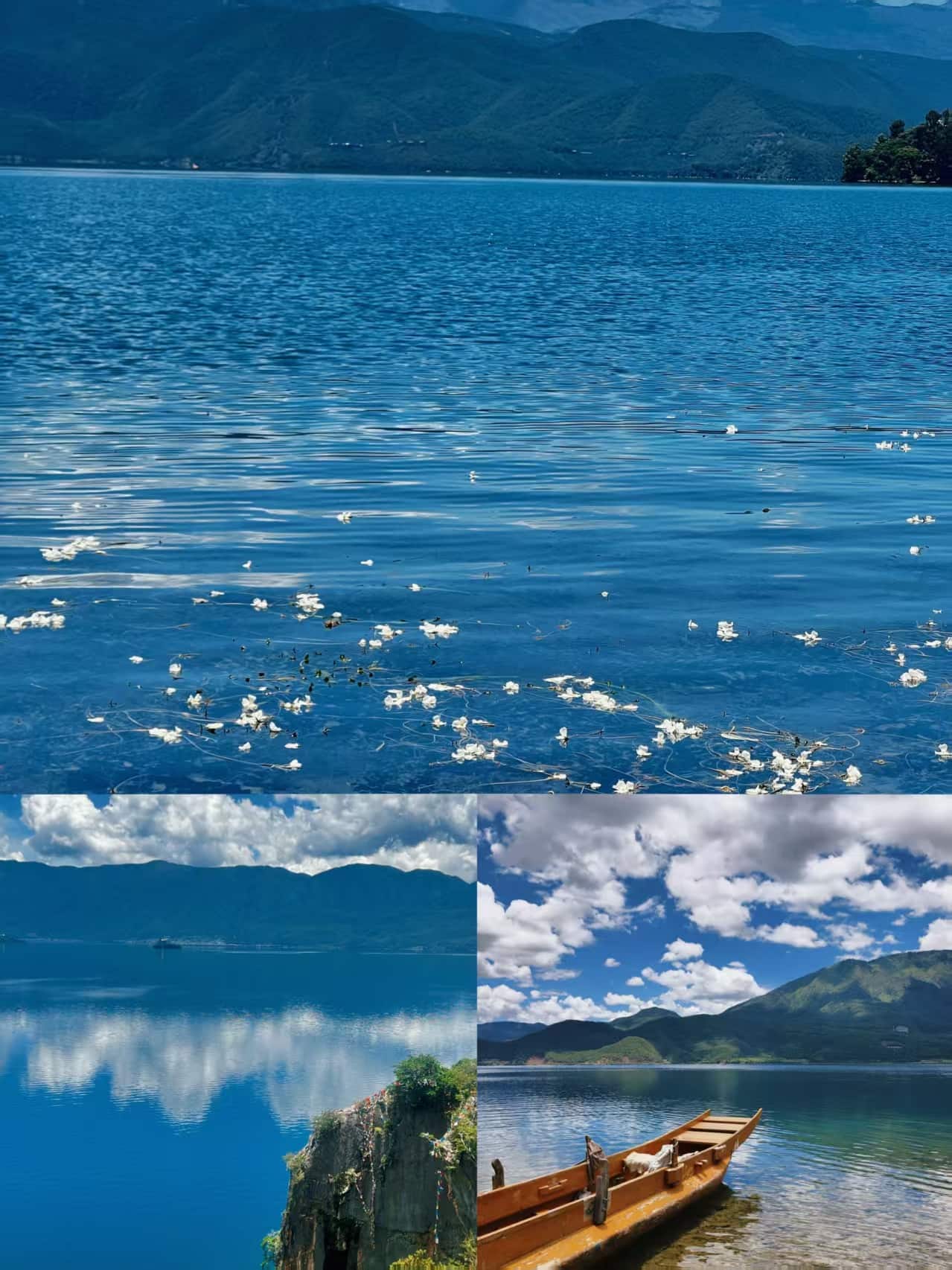 泸沽湖的水,是造物主最偏心的馈赠。清晨,薄雾如纱,湖面氤氲着淡淡的蓝,仿佛天空跌落人间;正午时分,阳光穿透云层,湖水便化作一块通透的琉璃,波光粼粼中倒映着远山的轮廓与云朵的轻盈;待到夕阳西下,整片湖面被染成金红色,猪槽船的剪影在余晖中摇曳,宛如一幅流动的油画。乘一叶木舟划入湖心,水波荡开,惊起几只白鹭,它们掠过水面,翅膀尖沾着湖水的清凉,飞向对岸的格姆女神山——那座被摩梭人视为圣山的神女峰,正以温柔的姿态守护着这片净土。