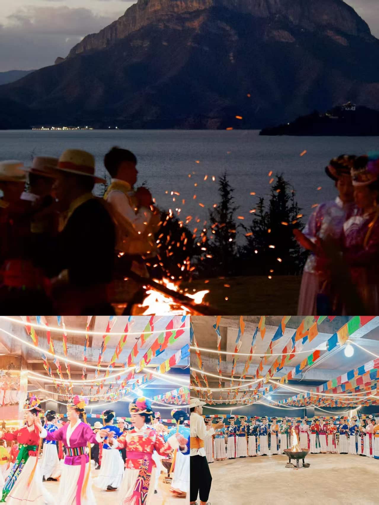 当夜幕降临,泸沽湖的星空便成了最奢侈的幕布。银河低垂,繁星如碎钻洒落湖面,仿佛触手可及。摩梭人的篝火晚会在此刻点燃,熊熊烈火映红了每个人的脸庞。身着传统服饰的阿妹们手拉手,围着火堆跳起甲搓舞,脚步轻快,歌声悠扬;阿哥们则吹响树叶,用最原始的方式传递着情意。游客们也被这份热情感染,加入舞圈,在火光与星光的交织中,忘却了身份与来处,只记得此刻的欢笑与自由。