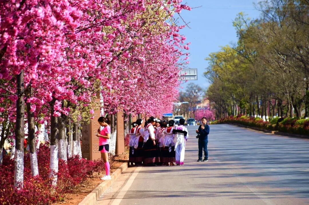 春天里,樱花大道上的那一抹粉色会让人格外期待,进入三月,位于丽江市古城区雪山路两侧的樱花树开始迎春盛放。花海如潮,在雪山的映衬下,景色宜人。以雪山为背景,