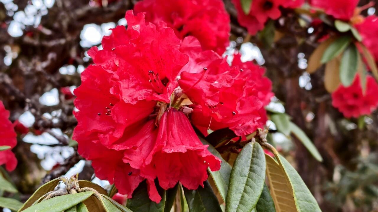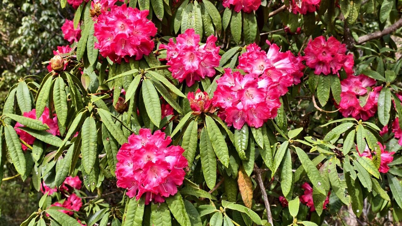 杜鹃依着山形肆意生长,一簇簇、一丛丛,如烈焰燃于青岗,似云霞落于峰峦,花瓣轻颤间,