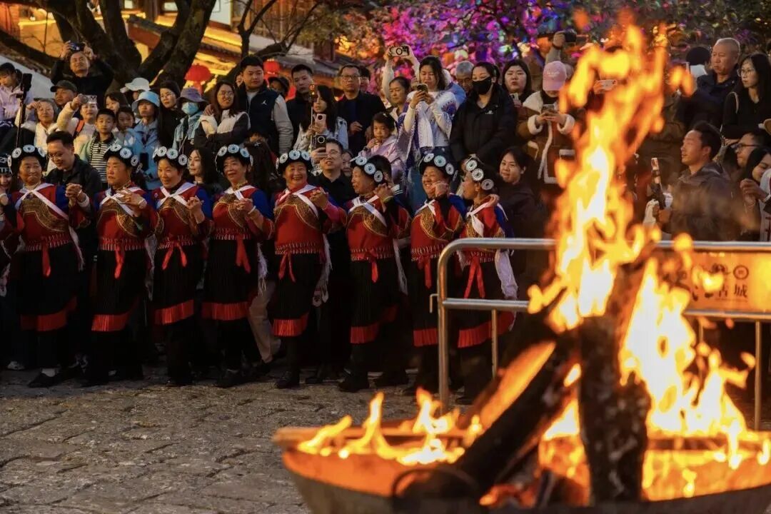 在丽江古城四方街,天南海北的游客和当地各族群众同歌共舞。图源:“丽江古城景区”微信公众号