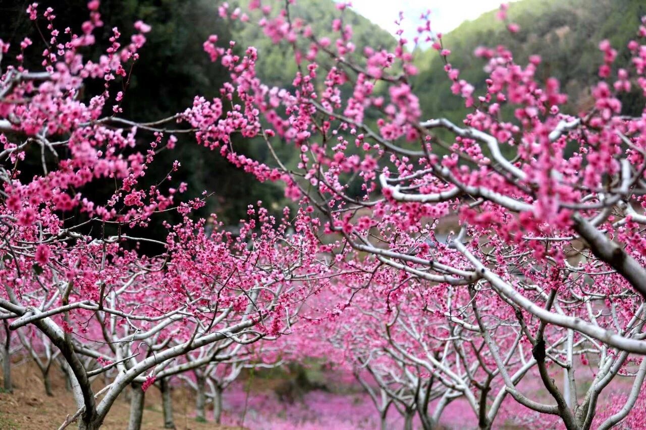 余亩雪桃林迎来盛花期,漫山粉黛连绵成海,勾勒出长江第一湾畔独一份的春日盛景。
