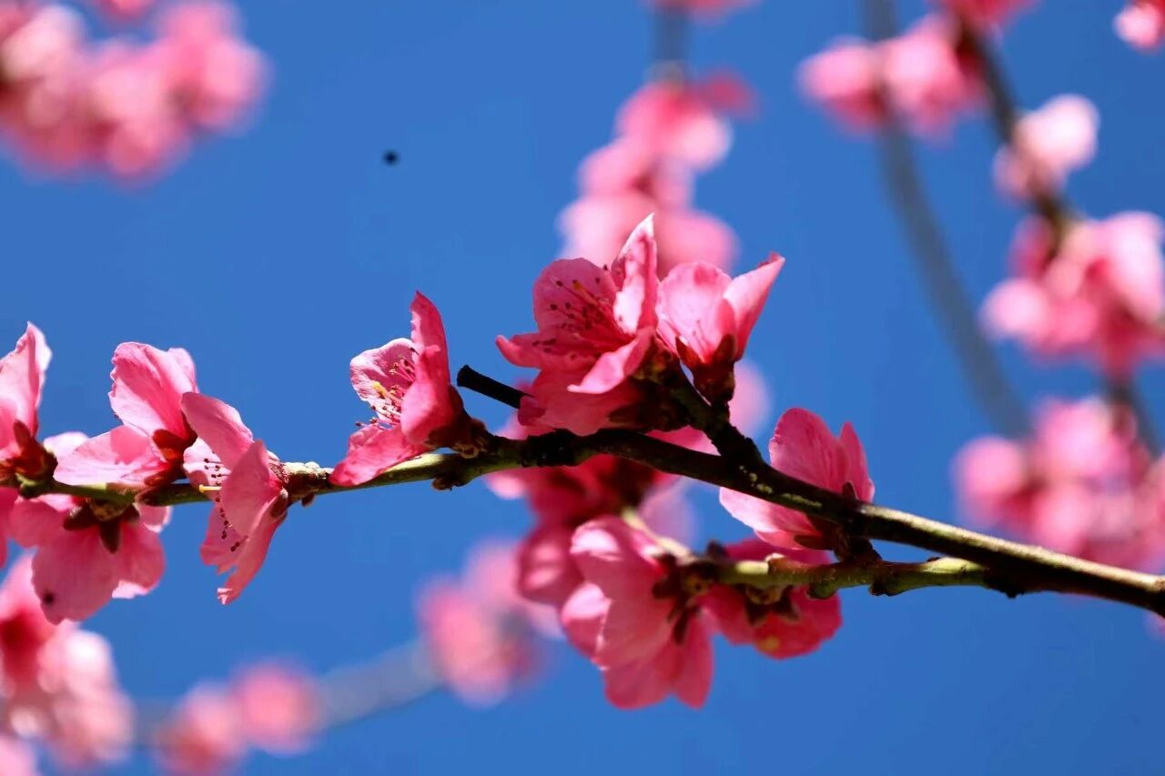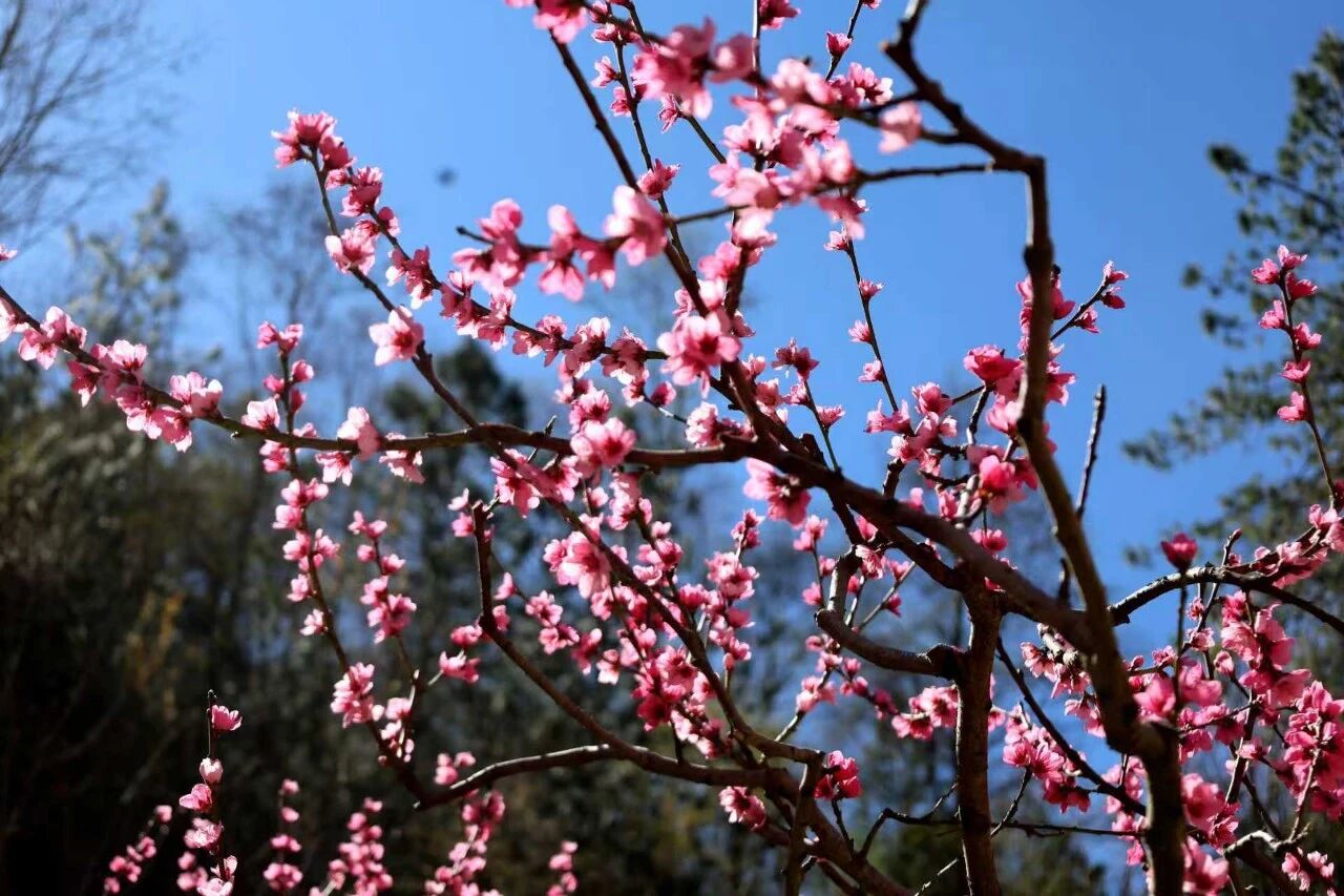 流动的春色画卷中。放眼望去,深浅交错的粉桃灼灼盛放,花瓣迎风轻颤,完美复刻陶渊明笔下“桃之夭夭,灼灼其华”的意境,抬眼皆