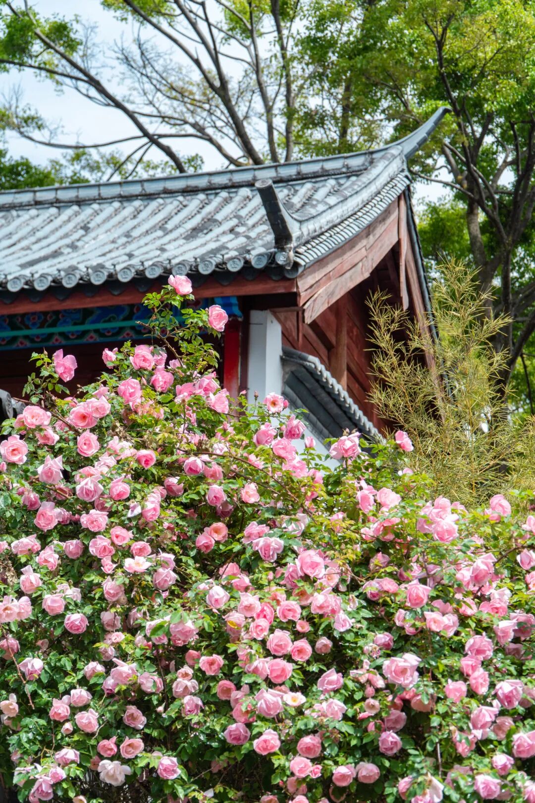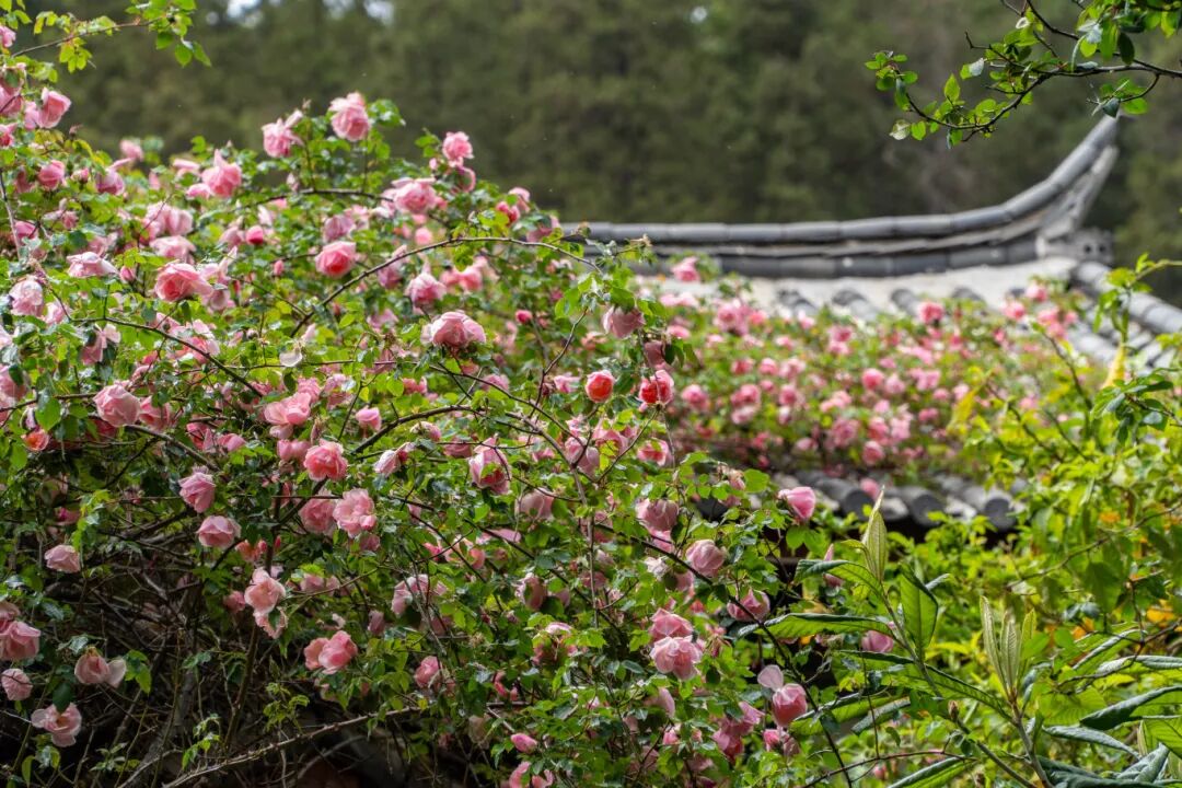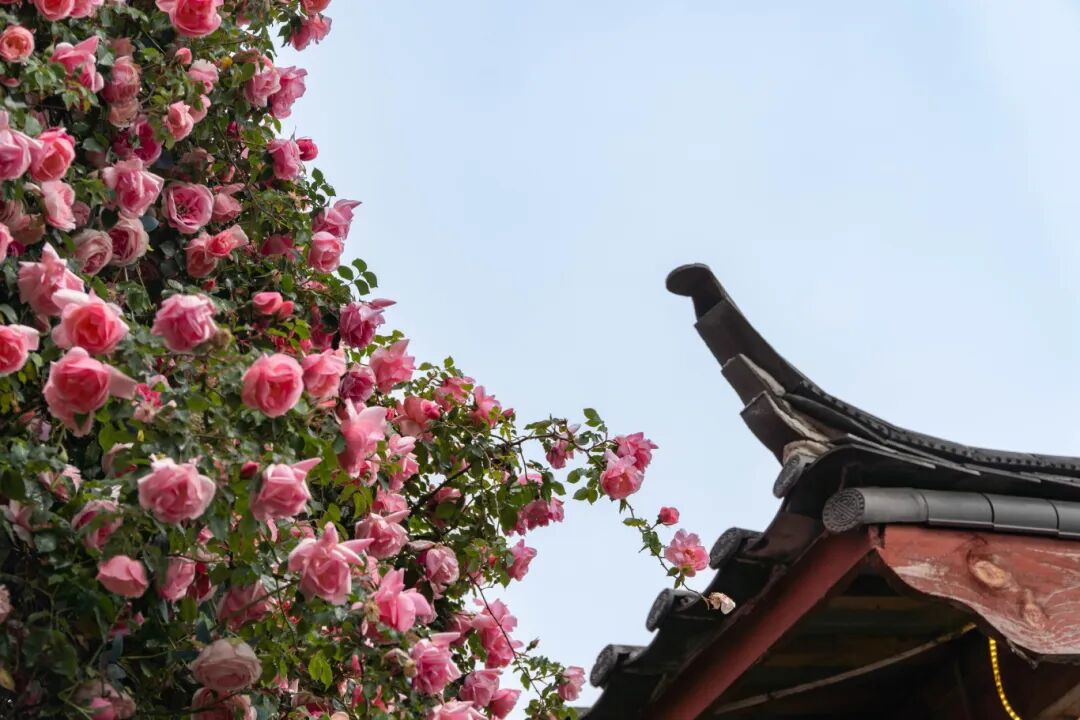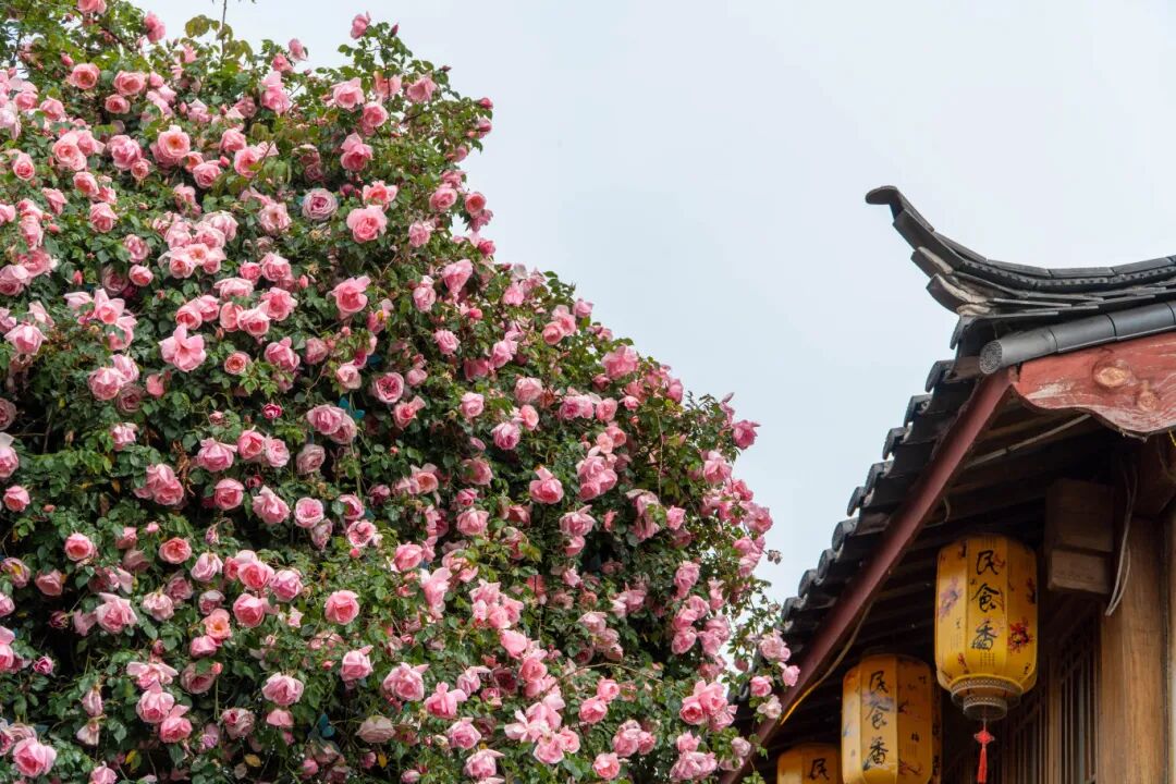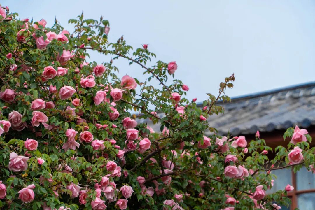 不是单纯的花墙,而是蔷薇爬在百年老院的木墙上、垂在青瓦屋檐下、绕着潺潺流水、