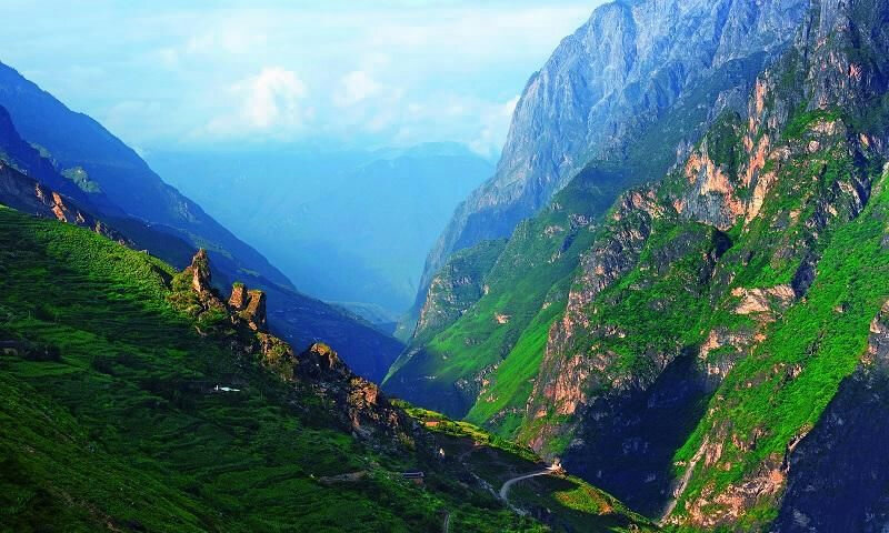 从塔城沿着澜沧江向西,走在云岭山脉白马雪山南段,茨中是金沙江与澜沧江的分水岭。进入三江并流区域最核心的高山峡谷,山高岭深,江面与峡谷相对高差从海拔2000米到4500米,金沙江河谷地带舒缓宽敞的江边平坝和缓坡消失,取而代之的是峻岭间江岸边的狭长过渡。