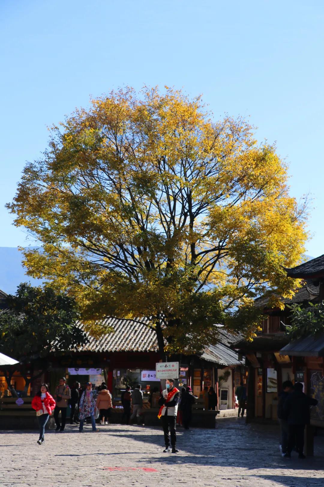 当然,徜徉在丽江古城,除了走街串巷饱览朴树的美,还可以登高俯瞰。从狮子山上俯瞰,城里的金黄一簇接着一簇,用镜头随便一框,便是一幅色彩绚丽的油画。