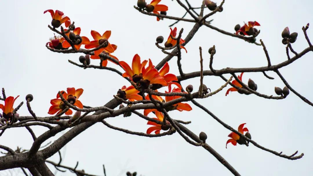 攀枝花树冠高大,树干上长有棱角,旱季叶子早已落光。自开春以来,一连串的花骨朵就开始缀满枝头,在春风来临之前,悄然酝酿,蓄势待发。