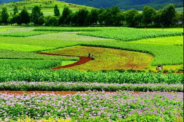 太安的洋芋花分别是:白色、粉色、紫色,3个不同的色彩,一朵朵的小花,就像一个情窦初开的少女,羞涩惹人爱。哈哈,虽然你吃过土豆,但是你有见过如此大片三色彩的花海吗?一行人漫步在色彩斑斓的三色世界,走在花间小道,随处可见的游客,在田间嬉戏拍照,轻轻抚摸花枝,俯下身细闻洋芋花粉的独特味道,香气扑鼻。站在小山峰俯瞰整个的洋芋花海,蓝天白云的天,和五颜六色的花海。花和天空,两种鲜明的颜色,搭配在一起,让眼前的景变成了一张美丽的明信片。