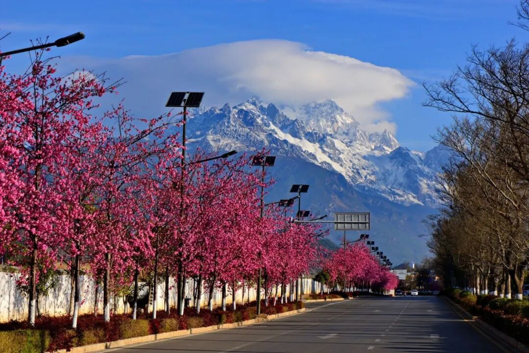 春天里,樱花大道上的那一抹粉色会让人格外期待,进入三月,位于丽江市古城区雪山路两侧的樱花树开始迎春盛放。花海如潮,在雪山的映衬下,景色宜人。以雪山为背景,